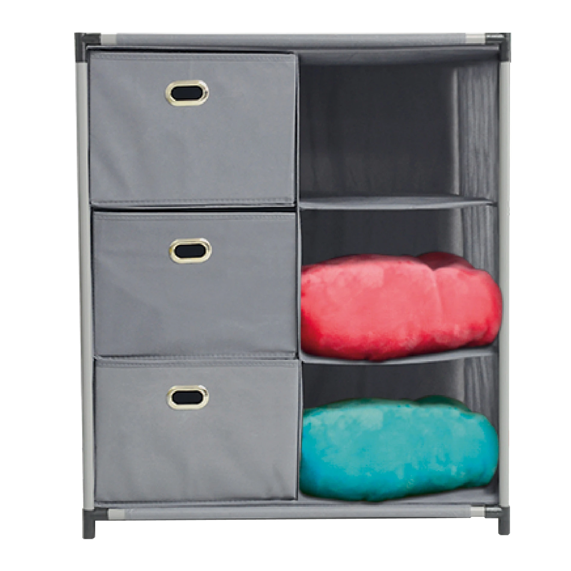 - ✅ Tres Cajones Intercambiables: Incluye cajones de tela que se pueden distribuir a tu gusto, brindando flexibilidad para almacenar diferentes tipos de objetos.