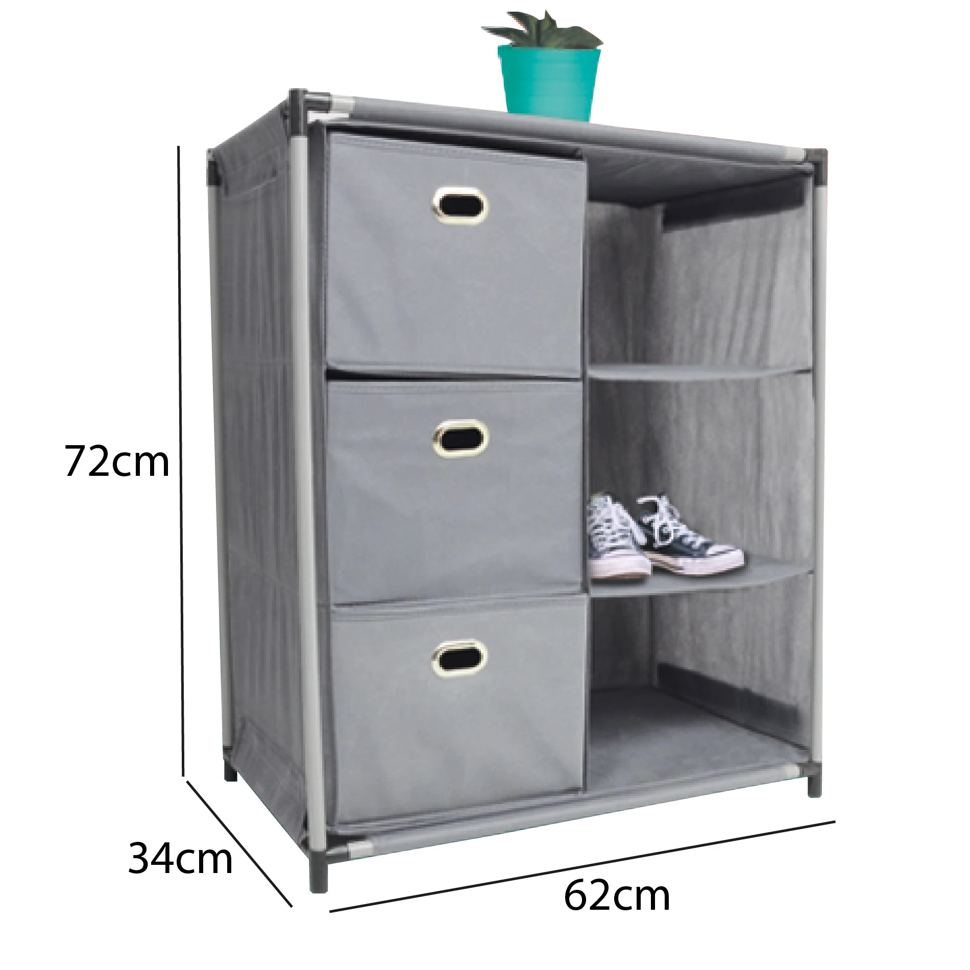 - ✅ Tres Cajones Intercambiables: Incluye cajones de tela que se pueden distribuir a tu gusto, brindando flexibilidad para almacenar diferentes tipos de objetos.